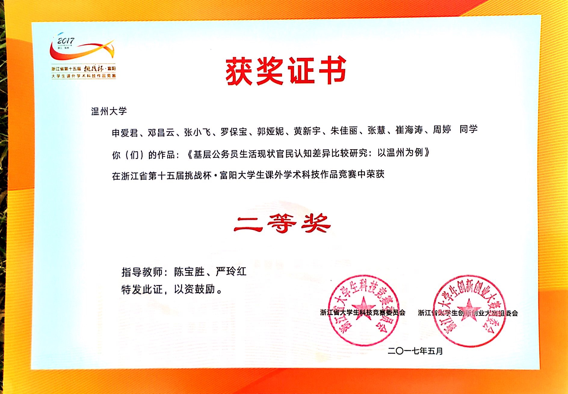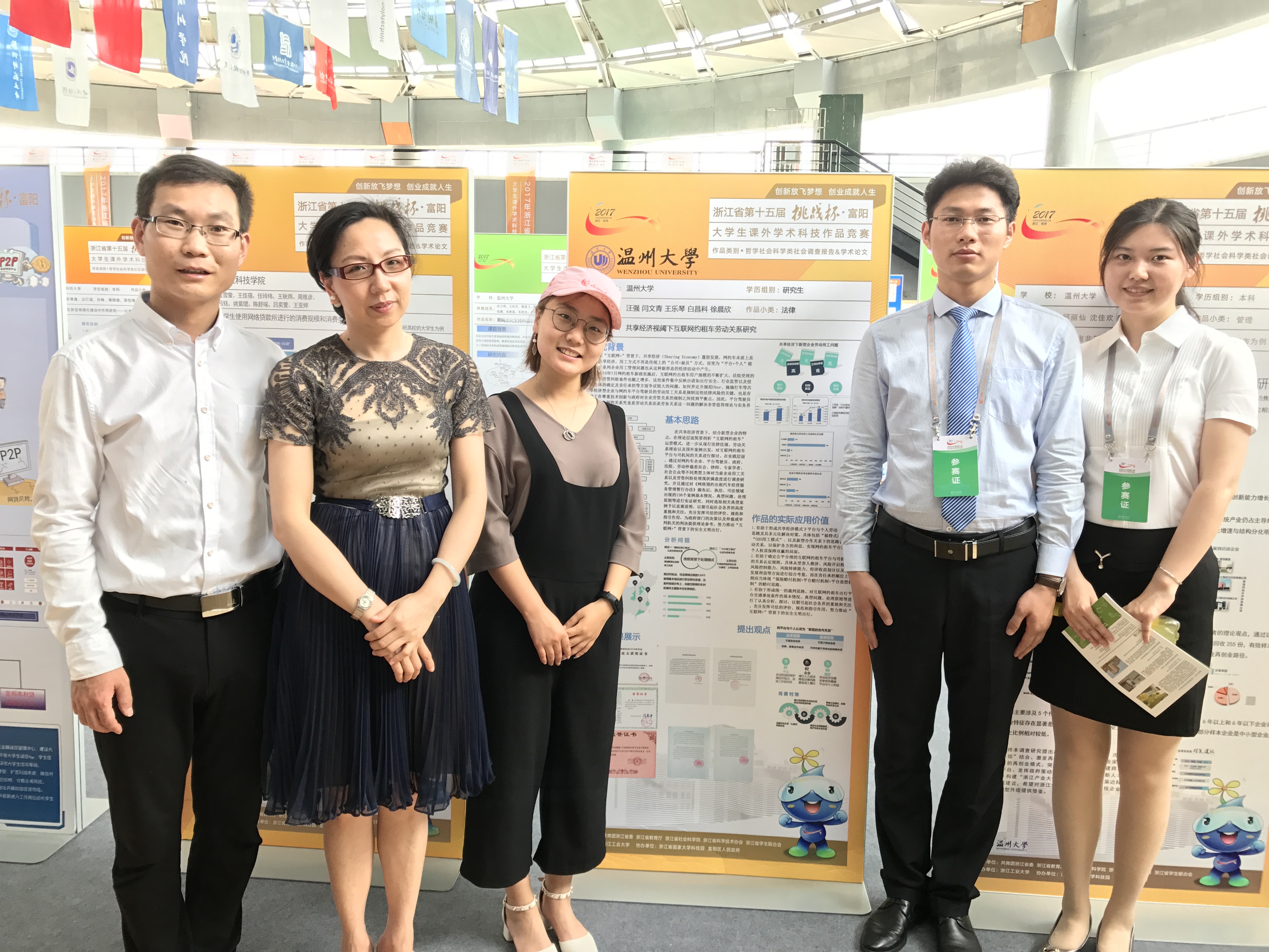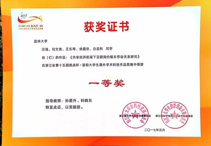 5月19日到21日,在由共青团浙江省委、浙江省教育厅、浙江省科学技术协会、浙江省学联和杭州市富阳区人民政府联合主办、浙江工业大学承办的浙江省第十五届"挑战杯"大学生课外学术科技作品竞赛决赛中喜获佳绩,其中老王论坛 汪强、闫文青、王乐琴、徐晨欣、白昌科等同学的作品《共享经济视阈下互联网约租车劳动关系研究》(指导老师孙德升、钭晓东)荣获决赛一等奖,老王论坛 申爱君、邓昌云、张小飞、罗保宝、郭娅妮、黄新宇、朱佳丽、张慧、崔海涛、周婷等同学的作品《基层公务员生活现状官民认知差异比较研究:以温州为例》(指导老师陈宝胜、严玲红)荣获决赛二等奖。
