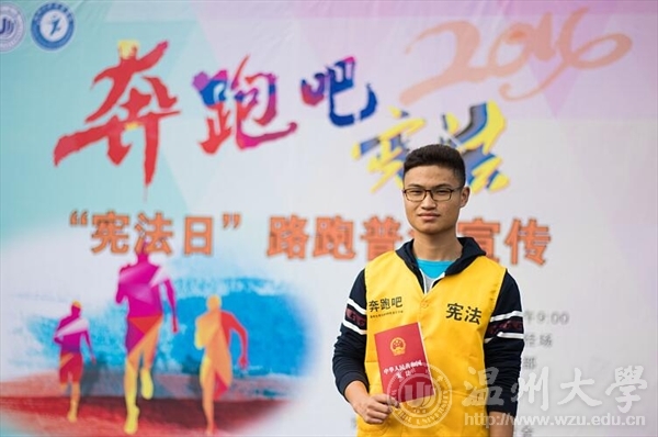 法政学院党总支书记林钦致辞,他谈到了宪法日设立的背景和意义,他说12月4日是我国的宪法日,设立国家宪法日,是推进宪法宣传教育、弘扬宪法精神、加强宪法实施的重要举措,也是增强法治观念、弘扬法治精神、夯实法治基础的有效途径,"奔跑吧,宪法"活动正是为了迎接这一特殊的日子而举办的,师生精心策划的本次活动将宣传宪法日与跑步结合起来别出心裁,希望全体参与者能够践行本次活动的宗旨——让宪法跑进生活,让宪法跑进心里!在学生代表宣誓和慢跑热身活动后本次路跑活动正式开始,路跑的终点处每一位参与者都领取了一本纪念版《中华人民共和国宪法》和本次路跑活动纪念徽章。