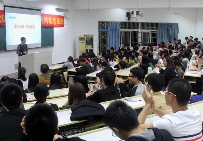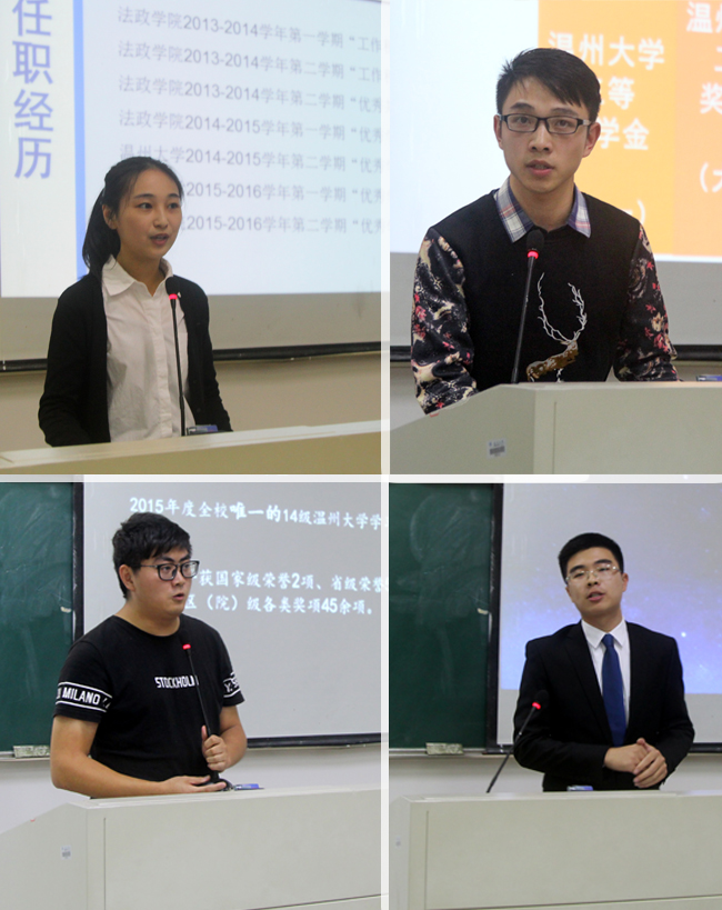 2016年11月13日晚上,法政学院举办2015-2016学年本科生"学习标兵"评选活动,并推选优秀学生参加校级"学习标兵"评选。本次评选共有13位符合条件的学生报名参加,学院学生科老师和各班级派出的70名主要学生干部担任评委,学院2016级的全部大一学生到场观看和学习。