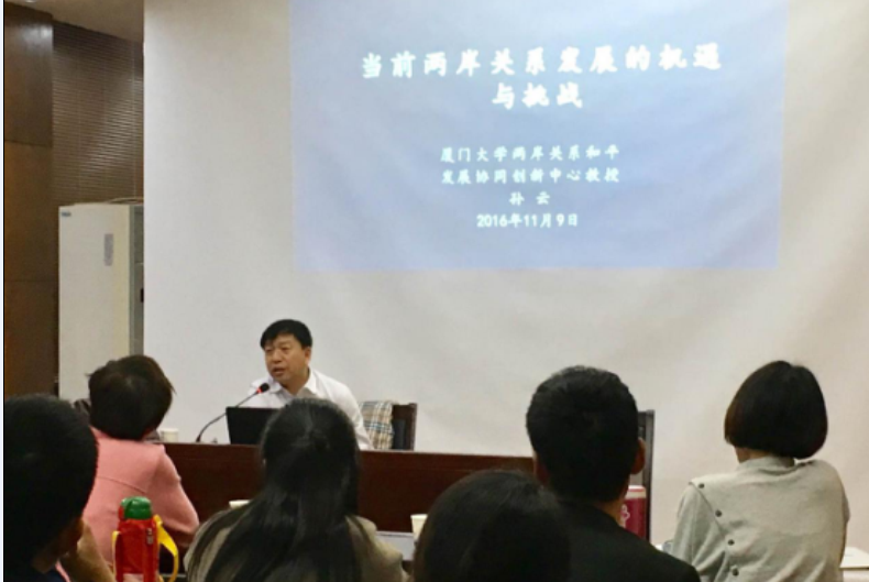 2016年11月9日,老王论坛 荣幸邀请到著名学者、厦门大学台湾研究院博士生导师、厦门大学两岸关系和平发展协同创新中心重大理论平台执行长孙云教授,就"当前两岸关系的机遇与挑战"问题,与本院师生进行学术交流。讲座在法政学院一楼报告厅举行,吴玉宗教授担任主持人,王勇副院长、付翠莲教授、徐旭东、朱婉菁等老师参加了此次学术活动。
