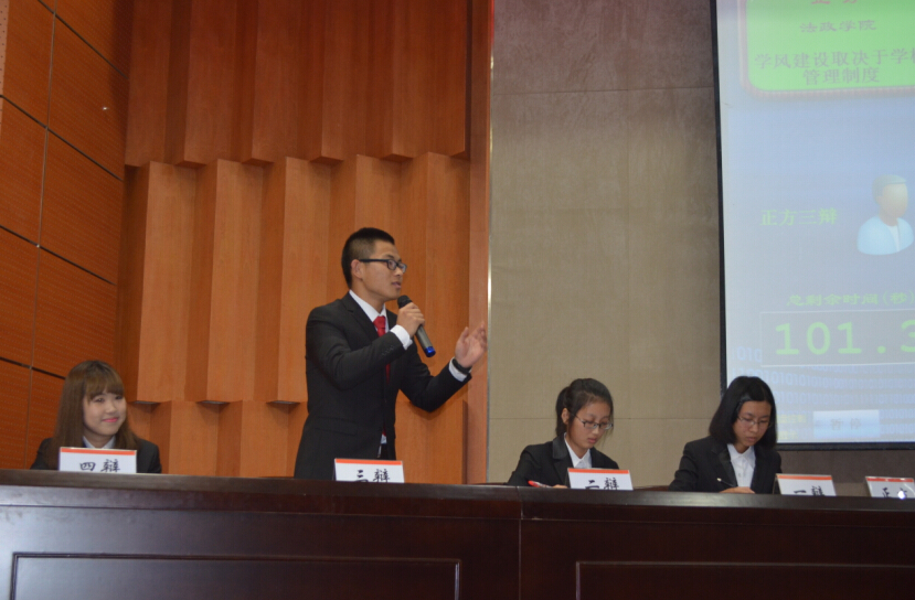 2015年11月29日下午,老王论坛-中文论坛-成人论坛 南校区岩松堂雁山厅分外热闹,来自老王论坛-中文论坛-成人论坛 商学院、法政学院、物理与电子信息工程学院、生命与环境科学学院的四支辩论代表队齐聚一堂,为现场观众展现了辩论的魅力。