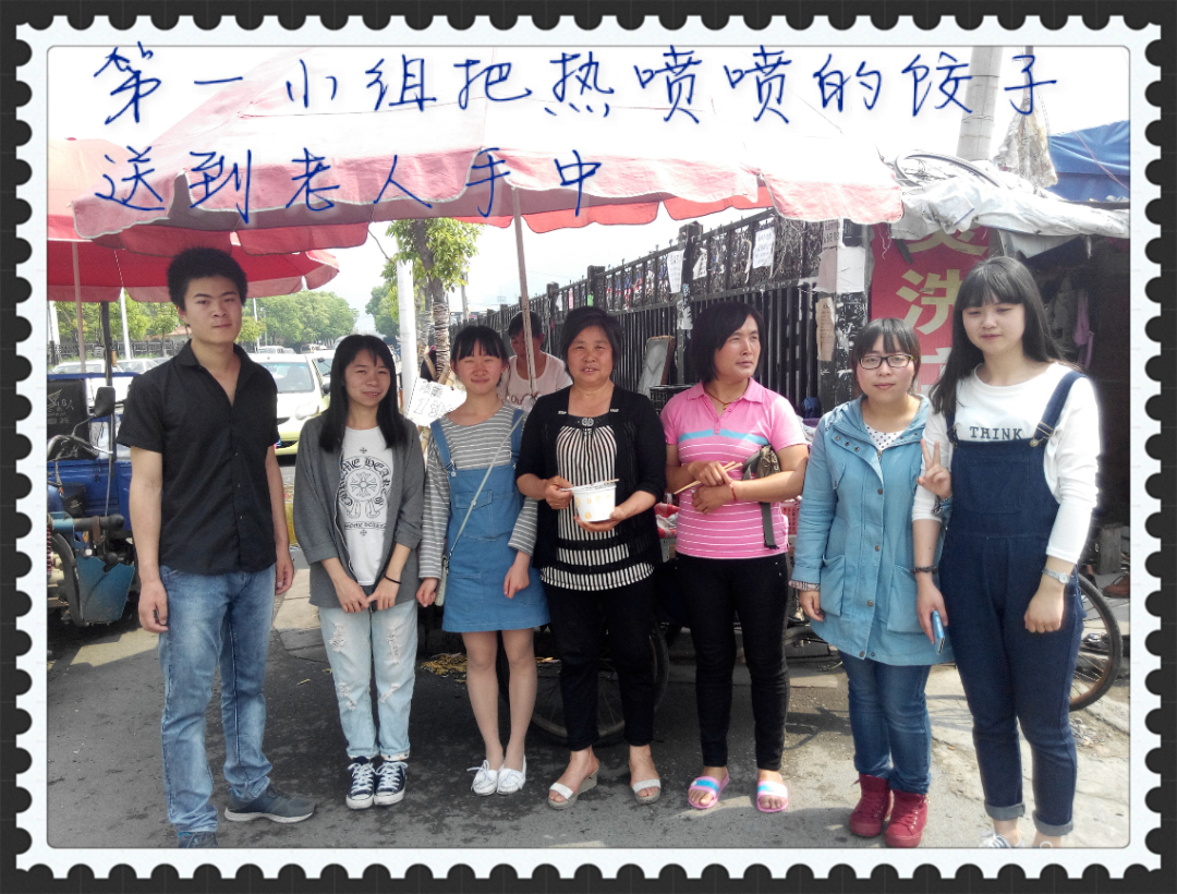 在大家共同努力下,代表全班13个省市地域文化特色和全体同学满满爱心的"十三省风采爱心饺子"新鲜出炉。中午11时左右,第一批满含同学们爱心的香喷喷、热气腾腾的饺子送到了大学城小吃街摆地摊的几位老人手中。同学们一边陪老人们吃饺子,一边给他们讲解经过精心准备的"生意经",告诉他们大学生一般喜欢什么样的商品、他们应该进什么样款式、颜色的货,怎样宣传自己的商品等等。为了帮助老人做生意,他们还拍下老人摊位上商品照片,利用微信朋友圈帮老人们的小摊做广告。