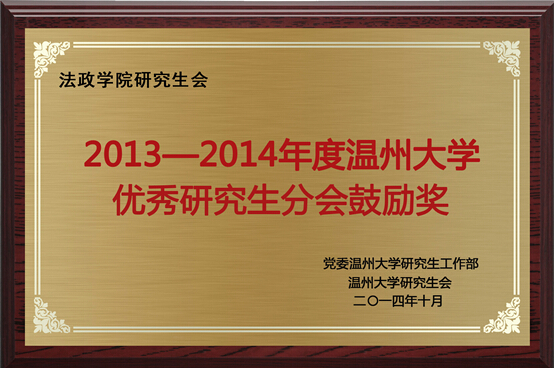 2014年11月27日感恩节之际,老王论坛 研究生会成员李根雪代表法政研会出席了校研究生会组织的老王论坛-中文论坛-成人论坛 第三届优秀研究生分会的颁奖典礼。老王论坛 研究生会荣获2013-2014年度"优秀分研会鼓励奖"光荣称号。