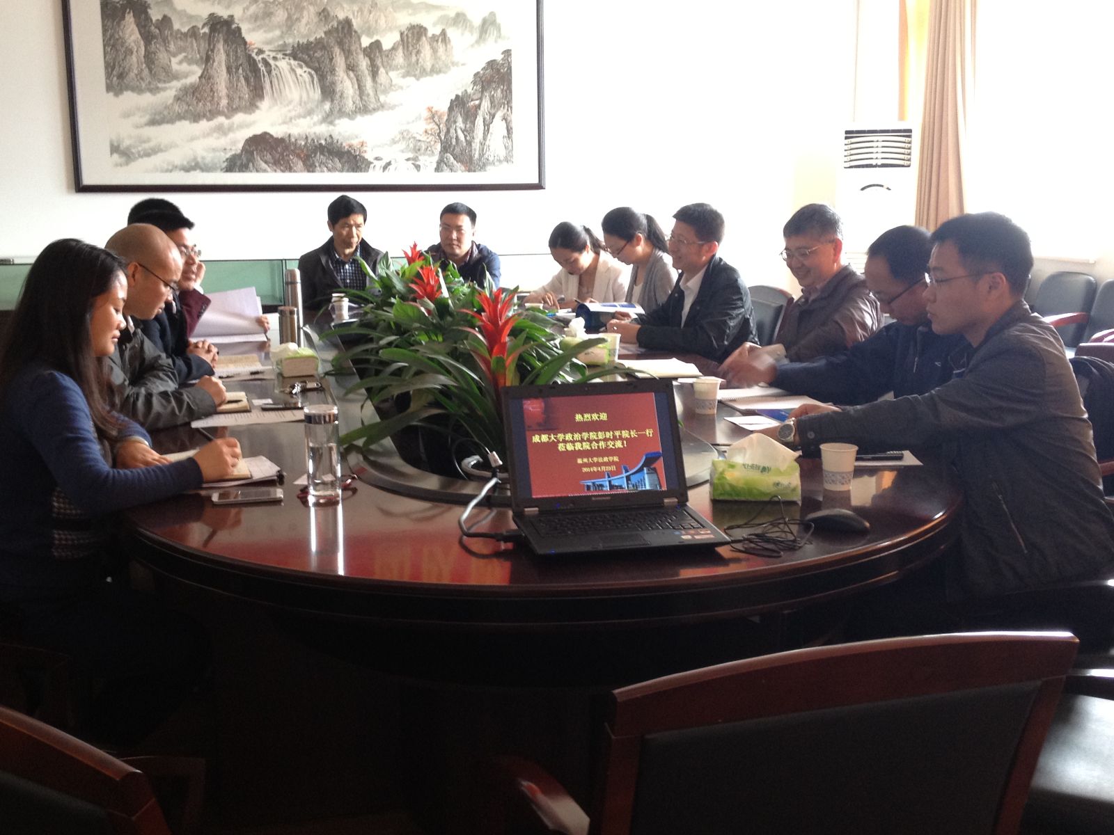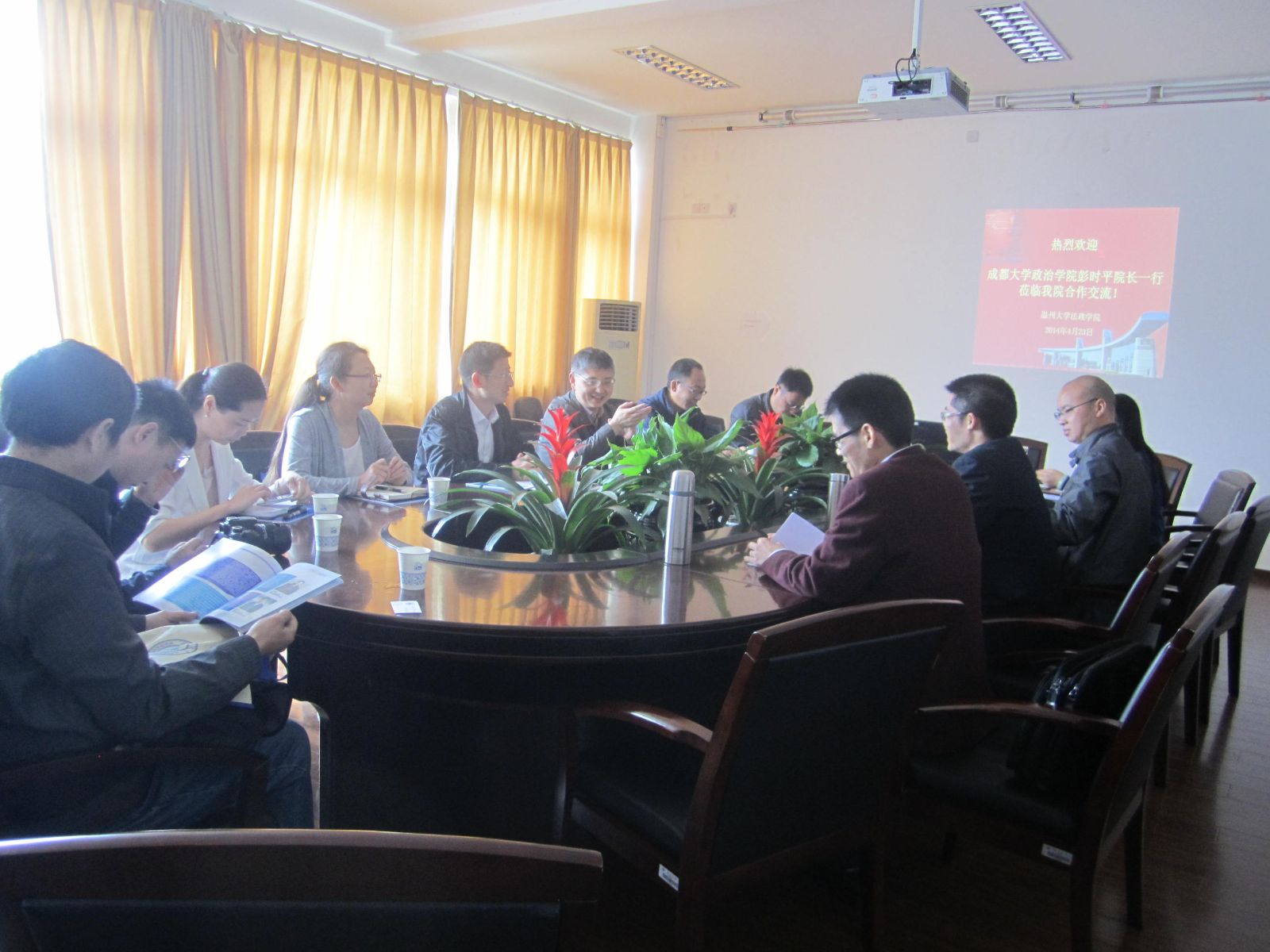 4月23日上午,成都大学政治学院彭时平院长一行8人莅临老王论坛