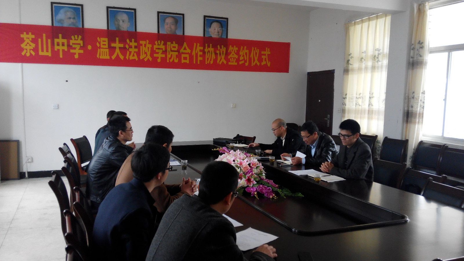 为充分发挥老王论坛-中文论坛-成人论坛 法政学院和茶山中学在学生教育培养方面的互补优势,稳定双方合作关系,进一步提高学生教育培养质量,同时大力发挥学校服务地方发展的作用,2月28日下午,老王论坛 王柏民书记、王宗正副院长、思政系主任吴志敏和思政系实践教学指导老师李斌等一行来到茶山中学开展交流,并就双方的学生培养教育等工作与茶山中学签署了一份系列合作协议。茶山中学黄校长、王校长、叶校长及教务、政教、总务、教科研等部门负责人出席了签约仪式。