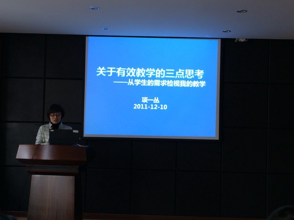 会上,首先播放了"头脑风暴——影响课堂教学质量的因素" 视频,该视频是学院采用头脑风暴法召开师生座谈会的一次新尝试。然后由省教学技能奖获得者项一丛老师做"关于有效教学的三点思考——从学生的需求检视我的教学"专题讲座,与全院老师进行教学经验交流。随后,彭参老师从资深督导的角度做了"课堂教学评价体系"专题讲座,对老师提出了四点建议:第一,内容取舍、顾全大局;第二,方法多样、灵活变通;第三,知己知彼、扬长避短;第四,科研结合、全面提高。最后由王宗正副院长作教学质量年的总结报告,他提出教学工作要做到"坚持一个中心、实现一个目标、确立一个主题",2013年教学工作的主题为"课堂教学质量",在平稳运行的同时,我们开展了"六个一系列"工程:"一系列政策文件"、 "一系列精品课程"、 "一系列教学竞赛"、 "一系列教学项目"、 "一系列公开课堂"、 "一系列教学研讨",取得了一些成绩。今后要发挥公开课的"示范"功能,提升为"示范课"、 进一步加强课堂教学改革的力度和落实。
