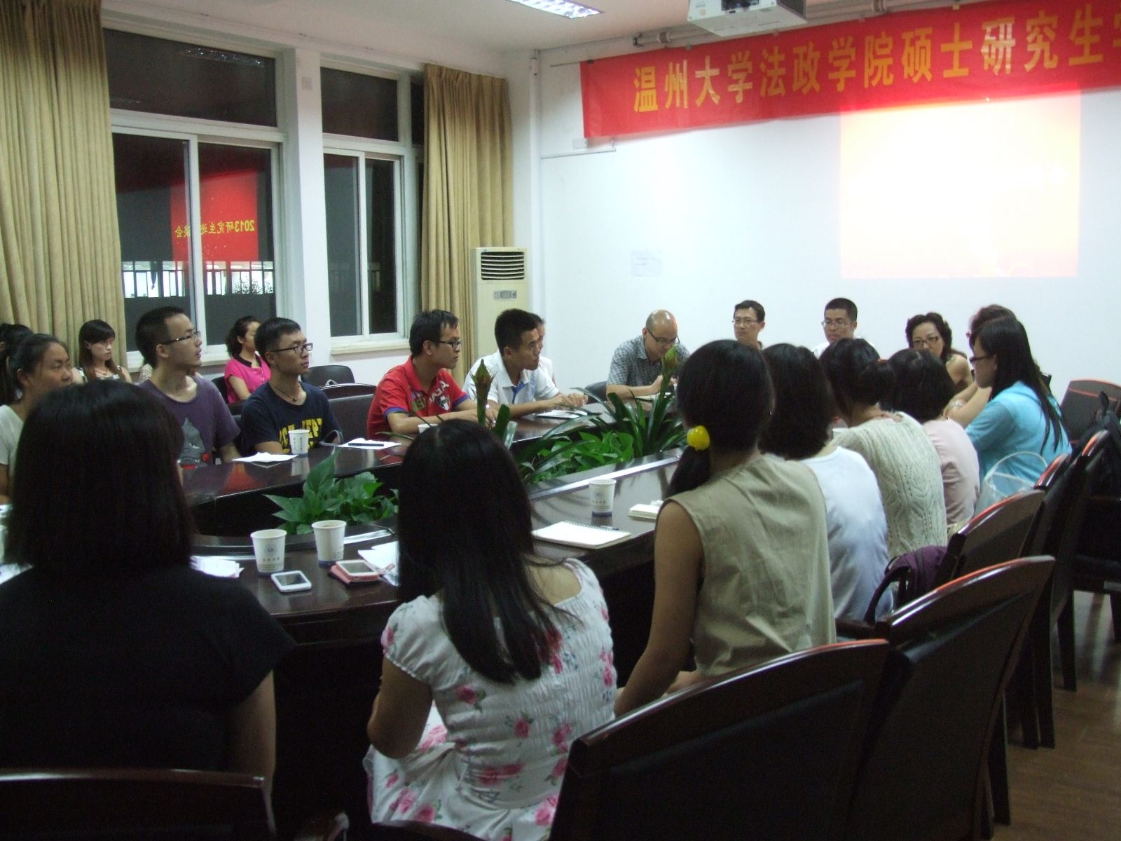 9月4日晚在法政楼307会议室,法政学院2013级研究生迎新班会如期举行。学院院长钭晓东、党总支书记王柏民、党总支副书记严玲红、副院长王宗正、教学科科长、研究生教学秘书、研究生班主任及来自全国各地的新生和研究生会代表参加座谈。本次座谈会由研究生教学秘书陈华娟老师主持。