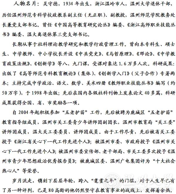 临近采访结束,吴守德老师祝福即将到来的温大八十周年校庆顺利开展,希望学校能培育出更多的社会栋梁人才。