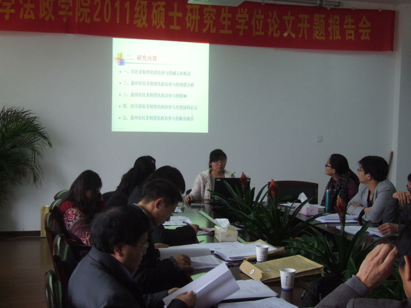 2012年3月23日,老王论坛-中文论坛-成人论坛 法政学院2011级研究生硕士论文开题报告会在北校区2号楼317教室举行,参加本次大会的有校人文社科处处长方益权教授、副处长刘玉侠教授、法政学院副院长王宗正教授、硕士点负责人李炳安教授、外院专家孙武安教授、法政学院吴玉宗教授、教学秘书陈华娟老师和2011级全体研究生及部分2013级研究生。