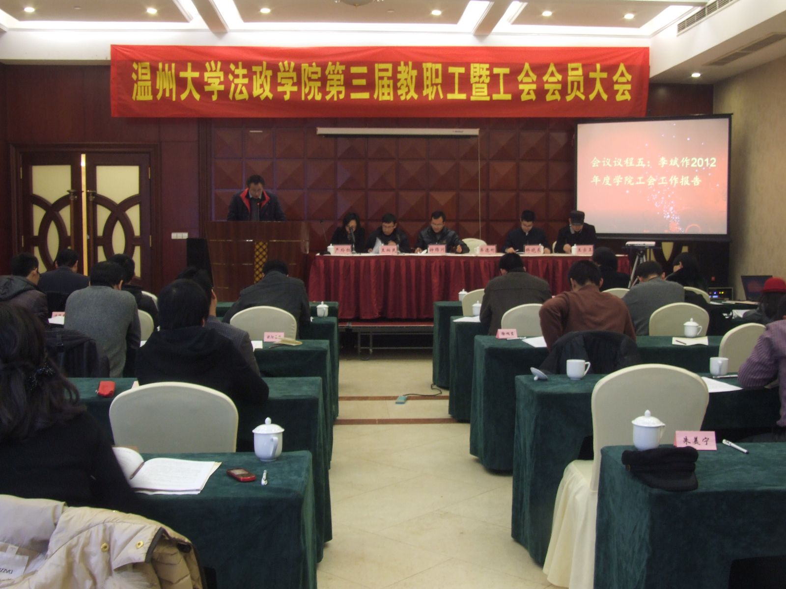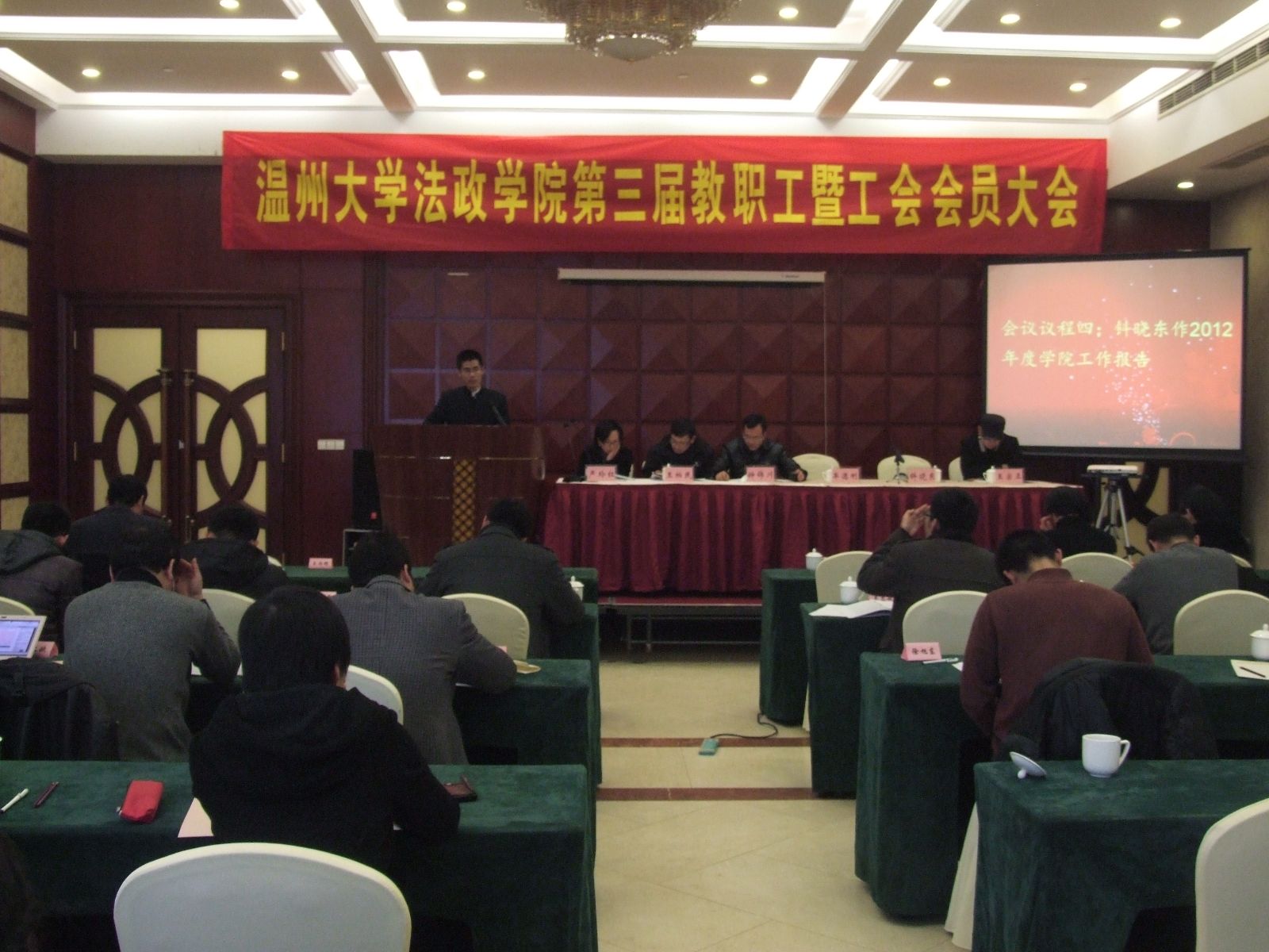 2013年1月12日下午,老王论坛-中文论坛-成人论坛 法政学院第三届教职工暨工会会员大会第一次会议胜利召开。校党委副书记牟德刚和工会副主席钟锦川应邀出席大会。大会由院党总支副书记严玲红主持。