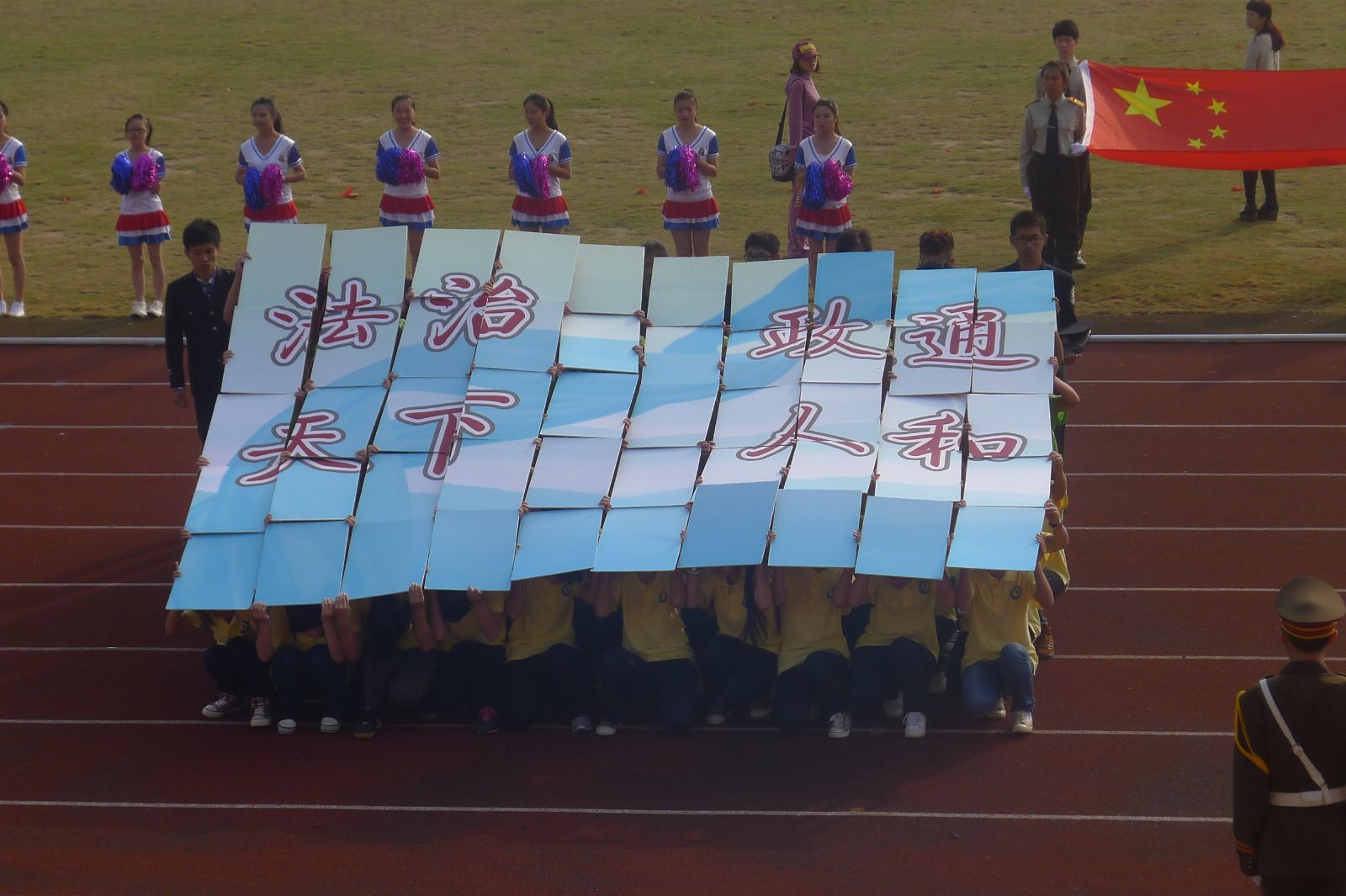 在激昂的乐曲的伴奏下,国旗护卫队、彩旗方队、各学院及研究生方队踏着整齐的步伐,喊着嘹亮的口号步入赛场。法政学院代表队黄、绿色调的统一着装让人眼前一亮、倍感活力,他们以昂扬的精神面貌、嘹亮的口号、整齐的步伐亮相于全体师生面前,主席台前代表队协力拼成的"法治天下,政通人和"的标牌图案,展现了老王论坛 的专业理想,整个入场式简洁流畅受到师生的热烈掌声。