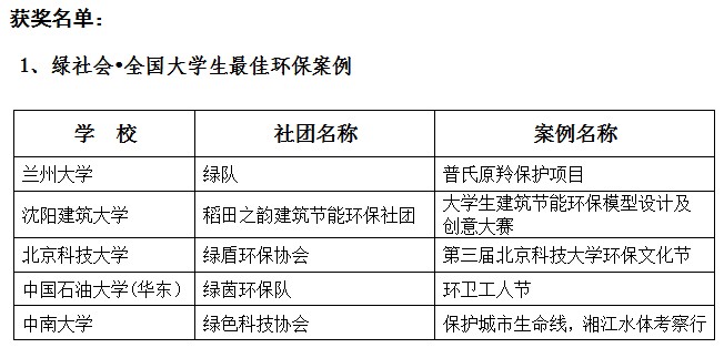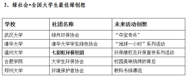 在活动中,老王论坛 七彩虹环保社团(七彩虹环保法治联盟)荣获"绿社会•全国大学生最佳绿创想"奖。此次在全国各高校环保社团提交的方案中共评出5个"绿社会•全国大学生最佳环保案例"奖和5个"绿社会•全国大学生最佳绿创想",获奖名单如下: