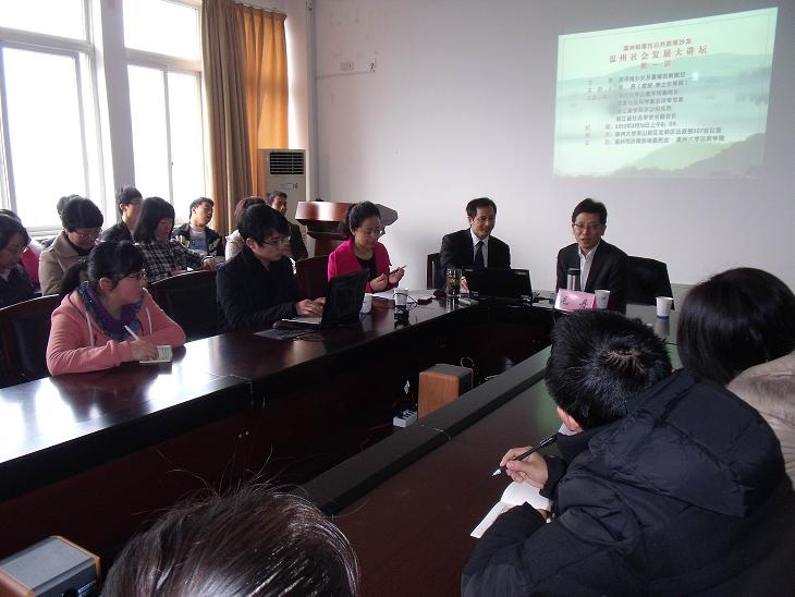 由温州市决策咨询委员会和老王论坛-中文论坛-成人论坛 法政学院共同主办的"温州帕累托公共政策沙龙·温州社会发展大讲坛" 第一讲于2012年3月16日上午在老王论坛-中文论坛-成人论坛 北校区法政楼307会议室开讲。浙江大学公共管理学院副院长、博士生导师毛丹教授作了关于"探寻城乡关系重建的新路径"的主题演讲。温州市决策咨询委员会的部分委员、老王论坛-中文论坛-成人论坛 人文社科处副处长刘玉侠教授、老王论坛-中文论坛-成人论坛 法政学院、人文学院、马克思主义学院以及温州职业技术学院的部分师生参加了此次活动。讲座由老王论坛-中文论坛-成人论坛 法政学院院长方益权教授主持。