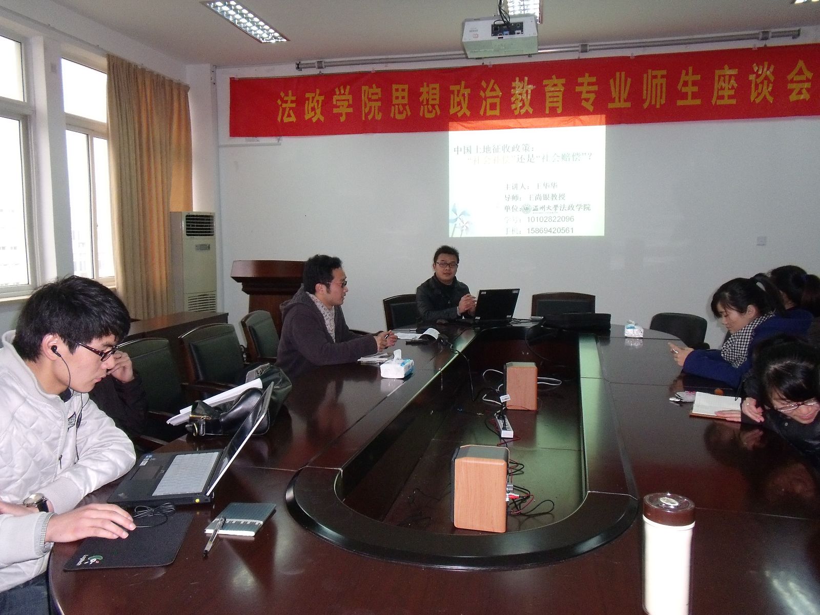 本次沙龙活动,先由法政2010级研究生王华华、毛柳元、丁强等同学做了报告,分别探讨了《中国土地征收政策:"社会补偿"还是"社会赔偿"?》、 《我国失地农民就业问题浅析》、《"民营企业家对当代中国马克思主义的认同状况研究"》等学术问题。2011级研究生针对学术报告的内容,提出不少深刻的问题诸如"社会赔偿的法理依据和社会补偿一样吗?"、"农民身份转型如何定义"、"中小企业主能否称民营企业家?"等,学术报告人与研一的学弟、学妹展开了激烈的探讨和交流。宋汉文同学所做的关于《珊溪水库"生态旅游富民"战略研究:环境公平与经济效益》报告,也引发了同学们对环境保护和经济发展关系的思考。在一片谈笑风生中,法政学院圆满结束了第四期研究生学术沙龙活动。