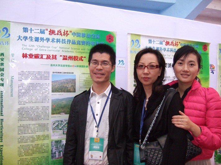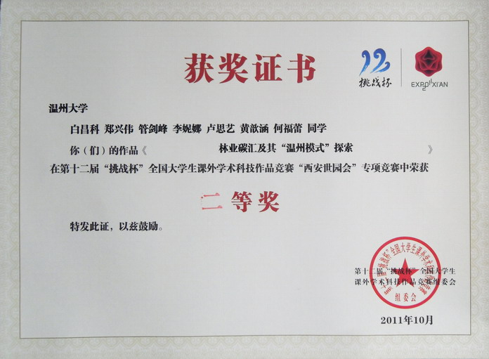 2011年10月15日至19日,第十二届"挑战杯"全国大学生课外学术科技作品竞赛终审决赛在大连理工大学举行,老王论坛 的挑战杯项目《林业碳汇及其"温州模式"的探索》,在白昌科、郑兴伟等同学组成的"七彩虹"团队、指导老师钭晓东教授、欧阳恩钱副教授的共同努力下,经过长期的跟踪调研论证,获得"西安世园会"专项竞赛二等奖,取得我校在该项赛事上的突破。