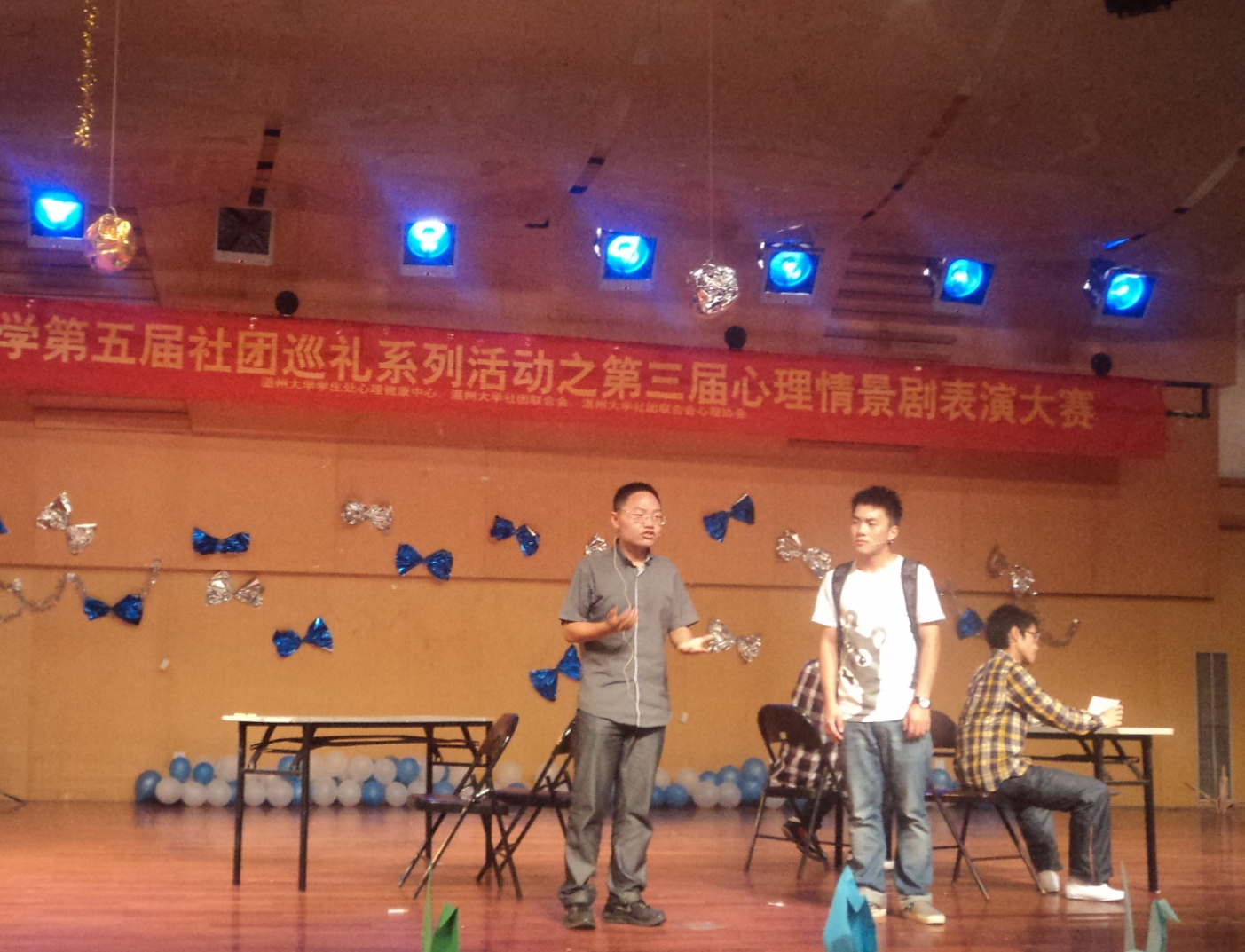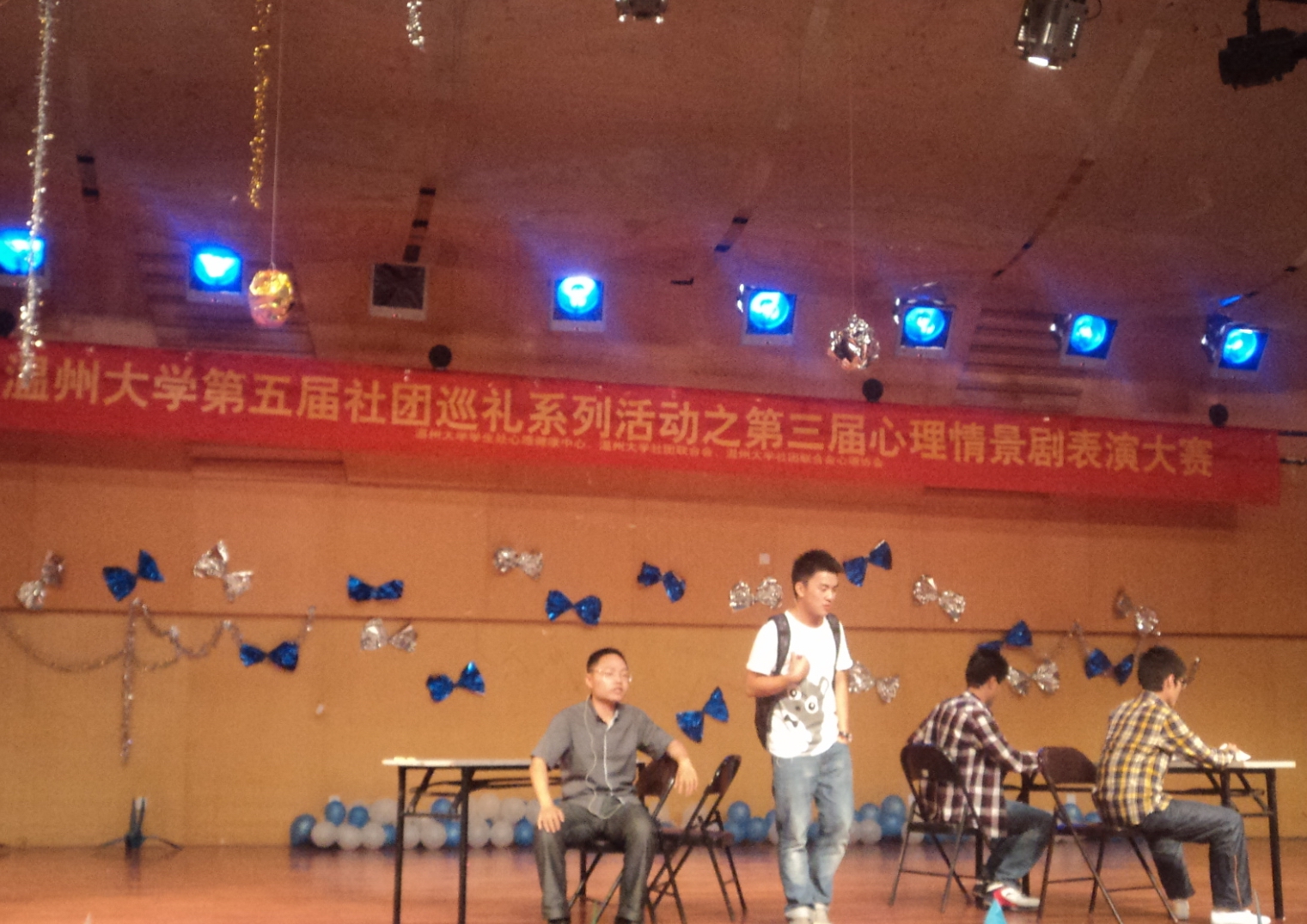 学生会心理部组织排练近一月、由顾佳妹、华天宇、陈才渊、吴颖、吴培、季耀、吴菲檑、俞佳敏、姜坤、彭浩棋、鲍欣媛等同学参演的心理情景剧《年轻的代价》正式登台亮相,演员们自信大方地走上舞台,神情专注地投入表演。他们凭着情真意切的表演,时而诙谐幽默,时而发人深省,引起了在场师生的共鸣和思考,为观众们上演了一场心灵视听盛宴。最终,老王论坛