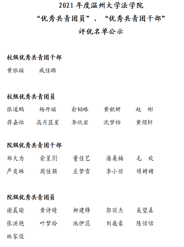 根据《团发〔2022〕2号:关于评选2021年度校“优秀共青团干部”、“优秀共青团员”的通知》,经学生本人申请、班级推荐、学院团委审核,通过民主投票选举产生,拟推选以下同学参评2021年度“校级优秀共青团干部”、“校级优秀共青团员”及“院级优秀共青团干部”、“院级优秀共青团员”,现将名单予以公示。
